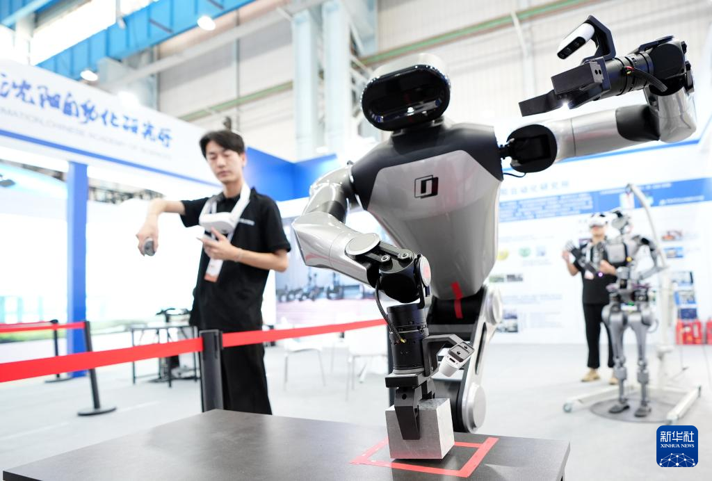 9月5日,在沈阳的2025全球工业互联网大会的展览区现场,中国科学院沈阳自动化研究所的机器人工程师在调试具身智能操作系统。