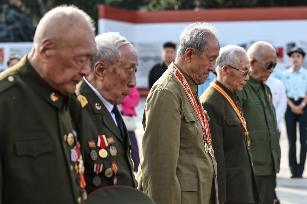 9月10日,抗美援朝老战士在祭奠活动中默哀。