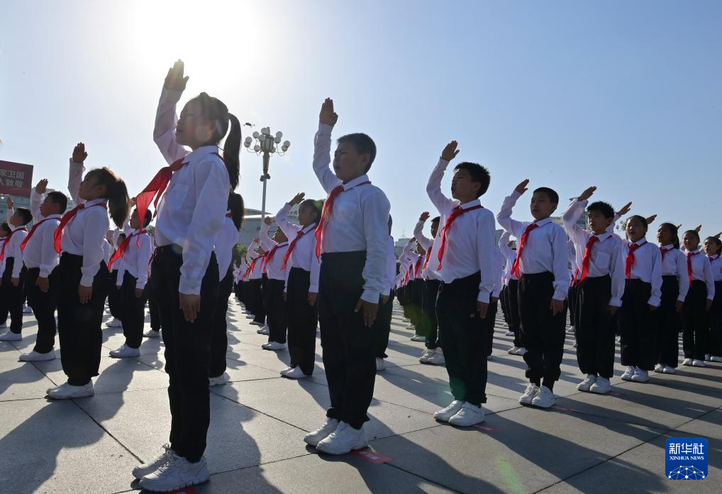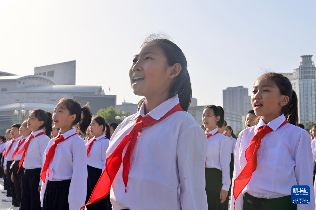 9月12日,参加升旗仪式的少先队员在唱少先队队歌。