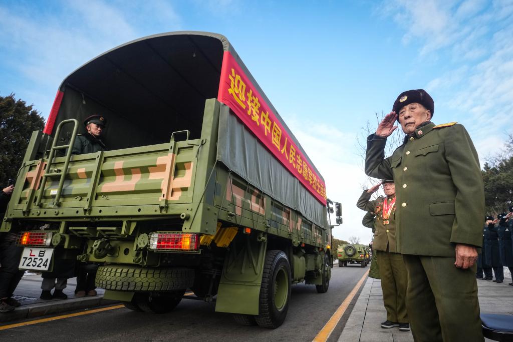 2024年11月28日,第十一批在韩中国人民志愿军烈士遗骸回国。运送志愿军烈士遗骸的车辆驶向沈阳抗美援朝烈士陵园。新华社记者 潘昱龙 摄