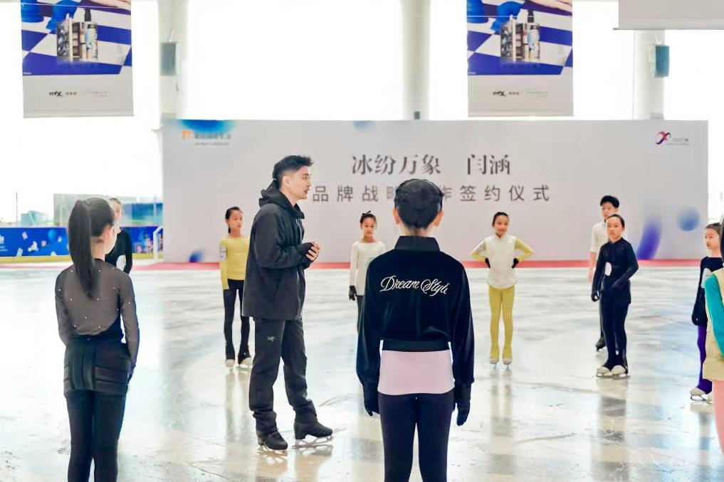 签约仪式现场气氛热烈。三名花样滑冰小选手率先献上了技艺娴熟的表演,灵动的旋转与流畅的步法赢得了满堂彩。随后的“小课堂”上,闫涵亲自上冰,对小学员们进行了细致的技术指导和动作示范,奉献了一场“干货”满满的教学课。活动尾声,他还与现场花滑爱好者围坐交流,亲切分享个人运动生涯的心得与故事。