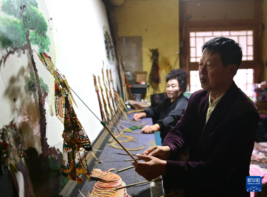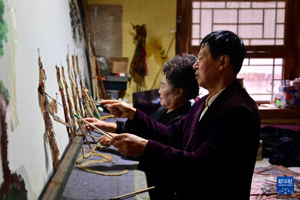 10月13日,宽甸八河川皮影戏第五代传承人王长水(右)和妻子在表演皮影戏《杨家将》。