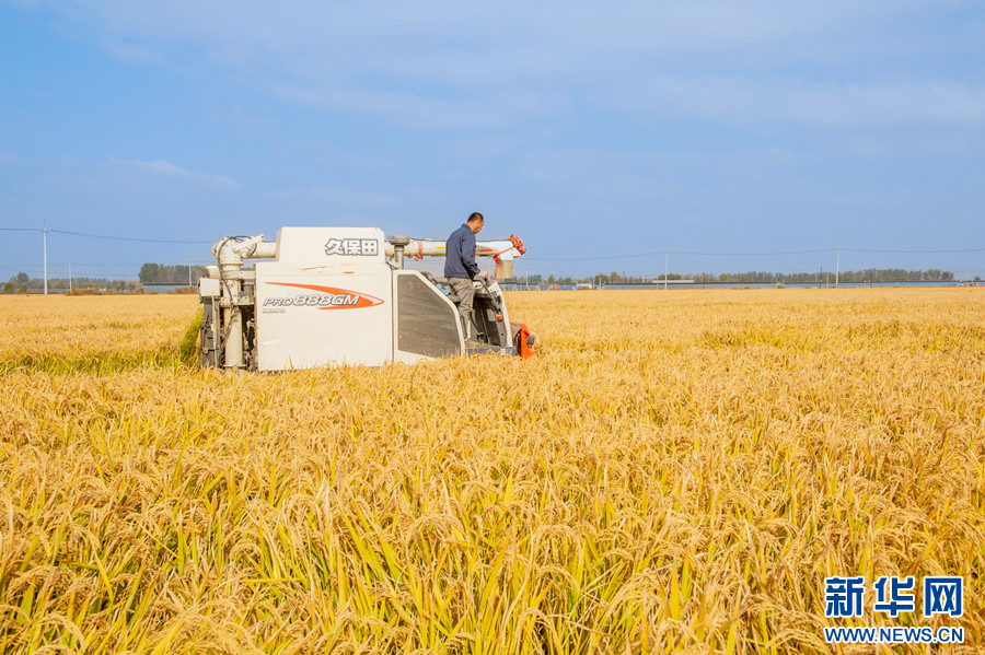 图为农户在辽宁省沈阳市辽中区杨士岗镇前邢村一处稻田收割水稻。新华网发