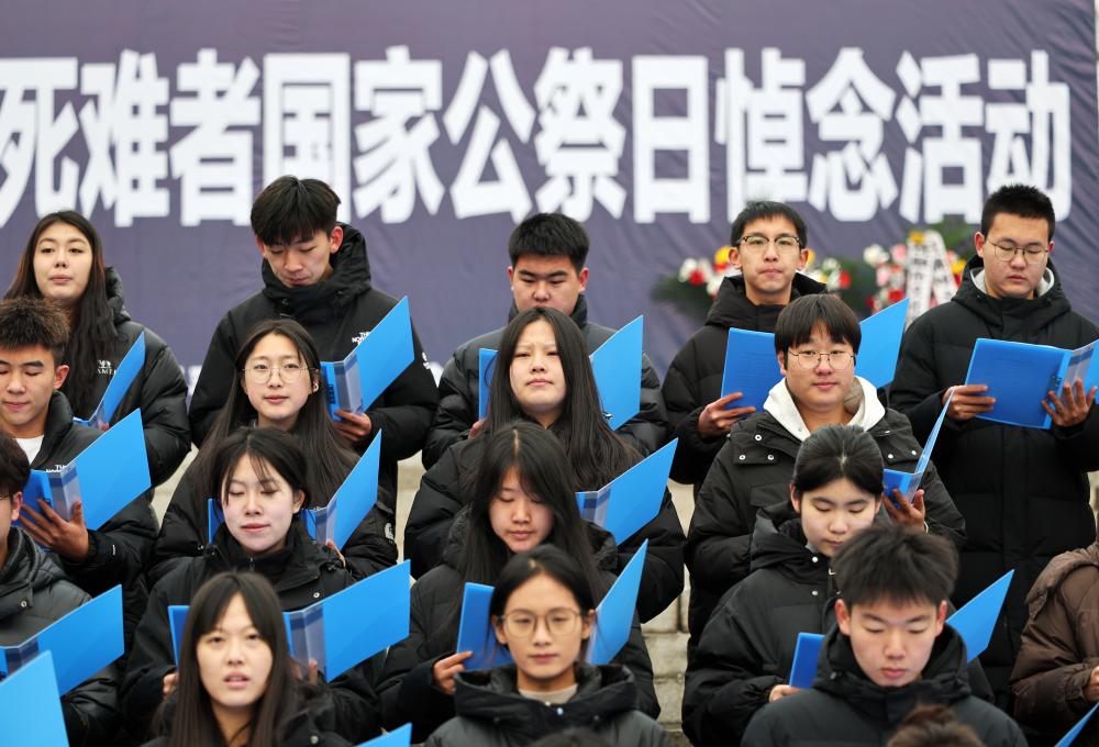 抚顺职业技术学院的学生代表朗诵“南京大屠杀死难者国家公祭鼎铭文”。新华社记者李钢 摄