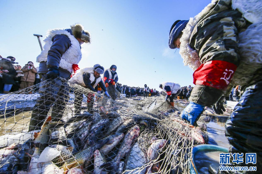 图为工作人员在沈阳市康平县卧龙湖进行冬捕作业。新华网发