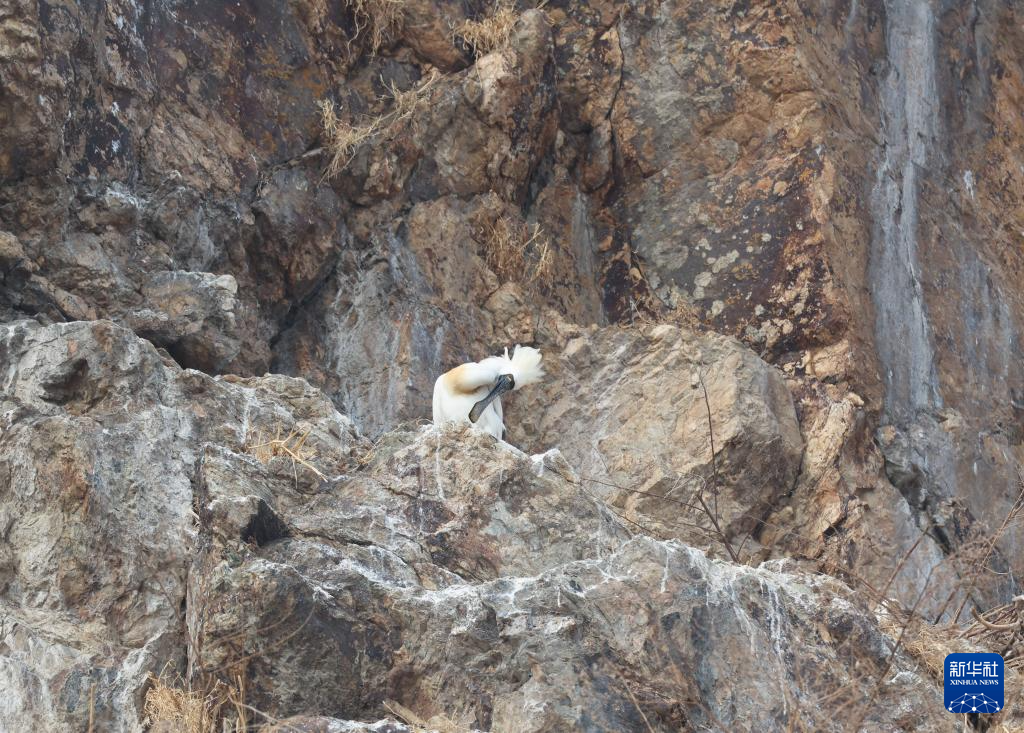 4月14日,辽宁省庄河市石城乡形人坨,黑脸琵鹭在崖壁上梳理羽毛。
