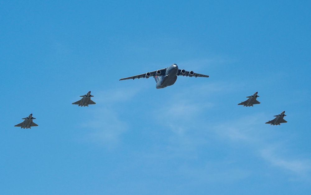 4月22日,接迎第十三批在韩中国人民志愿军烈士遗骸回国的空军运-20B飞抵沈阳,4架歼-20战机护航。新华社记者 李钢 摄