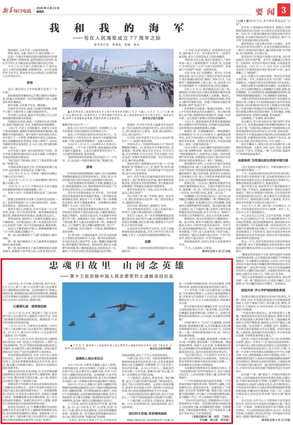 新华网沈阳4月23日电(记者孙仁斌 刘艺 丁非白 于也童 武江民 洪可润)4月23日出版的《新华每日电讯》发表题为《忠魂归故里 山河念英雄——第十三批在韩中国人民志愿军烈士遗骸迎回纪实》的重点报道,全文如下: