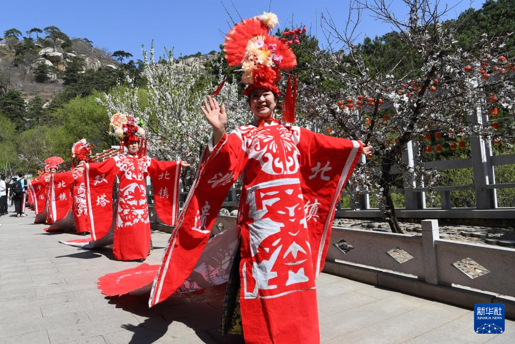 4月23日,在辽宁省北镇市医巫闾山景区,演员展示带有当地民间剪纸元素的特色服饰。