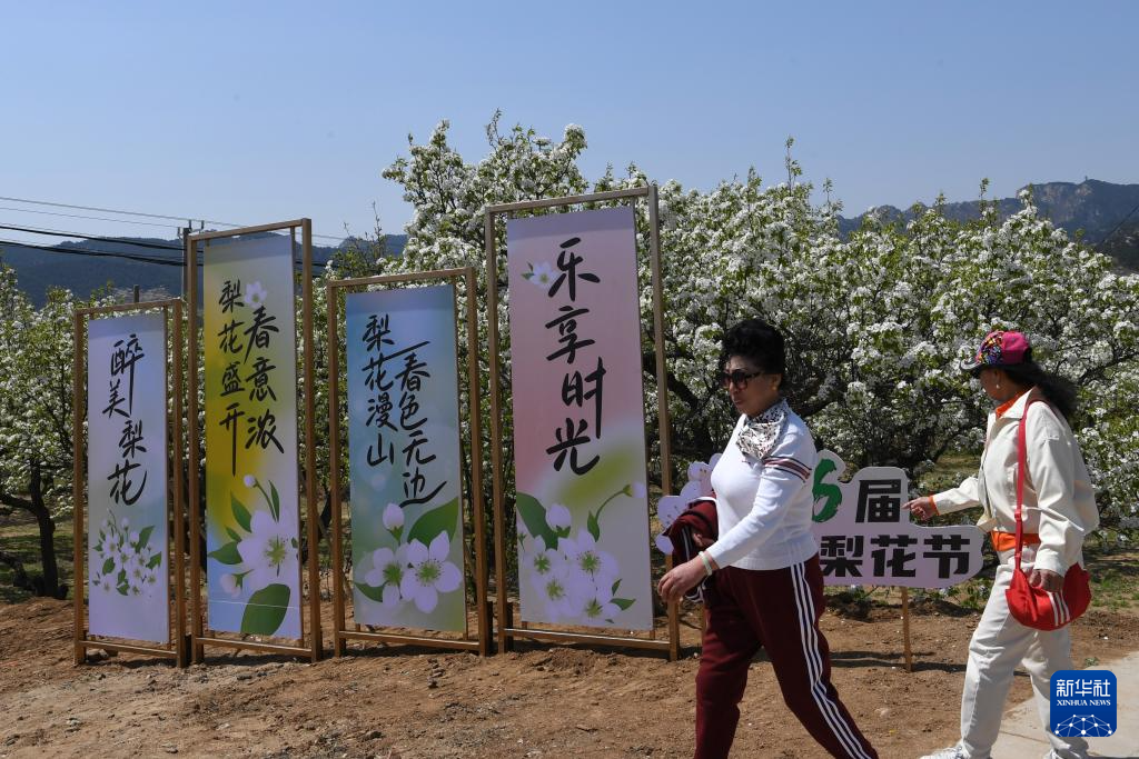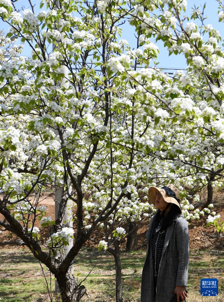4月23日,游客在北镇市罗罗堡镇河洼村梨园赏花游玩。