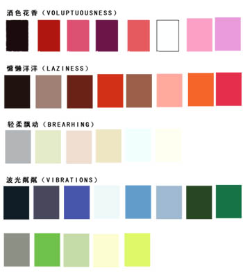 本季节的流行色,与以往的不同点在于没有对流行色彩进行应用类别的细分,只提出了总体方案,顺应了现时流行色彩应用中的类别界线越来越模糊的趋势发展。本季流行色共分四个色组,共三十六只色。