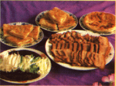 大饼用肉汤食盐和调料加入面粉中和成酥软面团,醒面时间较长,擀片抹油,重复擀几次,烙制成饼。其特点是熏肉肥而不腻,瘦而不柴,熏香浓,色泽红;大饼色黄清香,里软外酥层次多。