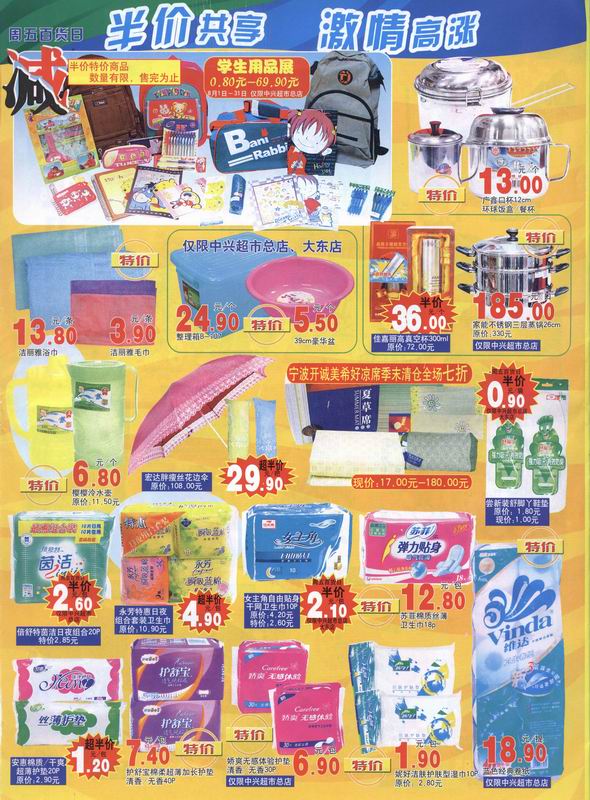 中兴超市一周七天,每天均有一类商品半价销售,周一洗涤日、周二休闲食品日、周三熟食糕点日、周四生鲜食品日、周五日用百货日、周六酒水饮料日、周日调料食品日,循环省钱计划,半价、特价继续在行动 …… 欢迎惠顾! 中兴超市总店地址:沈阳中兴商业大厦二楼 电话:23828888-3289