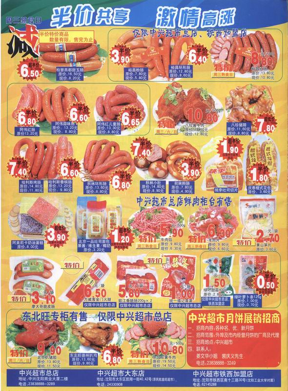 中兴超市一周七天,每天均有一类商品半价销售,周一洗涤日、周二休闲食品日、周三熟食糕点日、周四生鲜食品日、周五日用百货日、周六酒水饮料日、周日调料食品日,循环省钱计划,半价、特价继续在行动 …… 欢迎惠顾!中兴超市总店地址:沈阳中兴商业大厦二楼电话:23828888-3289