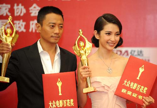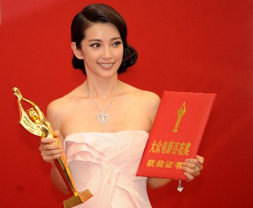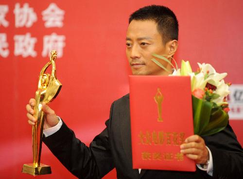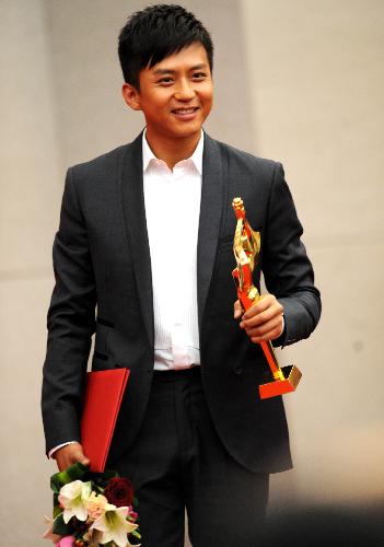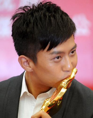 获得最佳男配角奖的邓超在记者见面会上亲吻奖杯