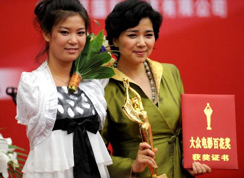 获得最佳新人奖的雷庆瑶在记者见面会上用脚写下自己的名字